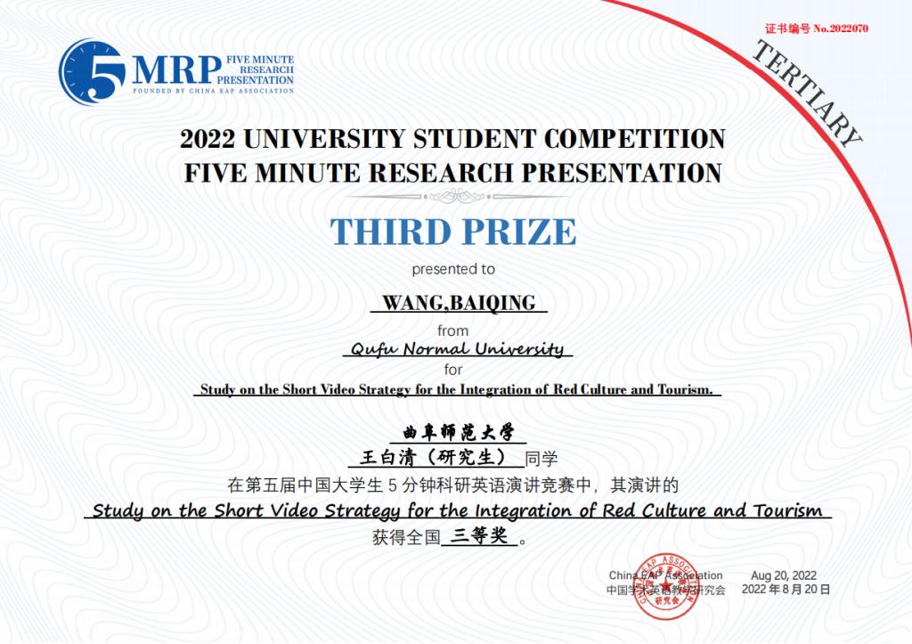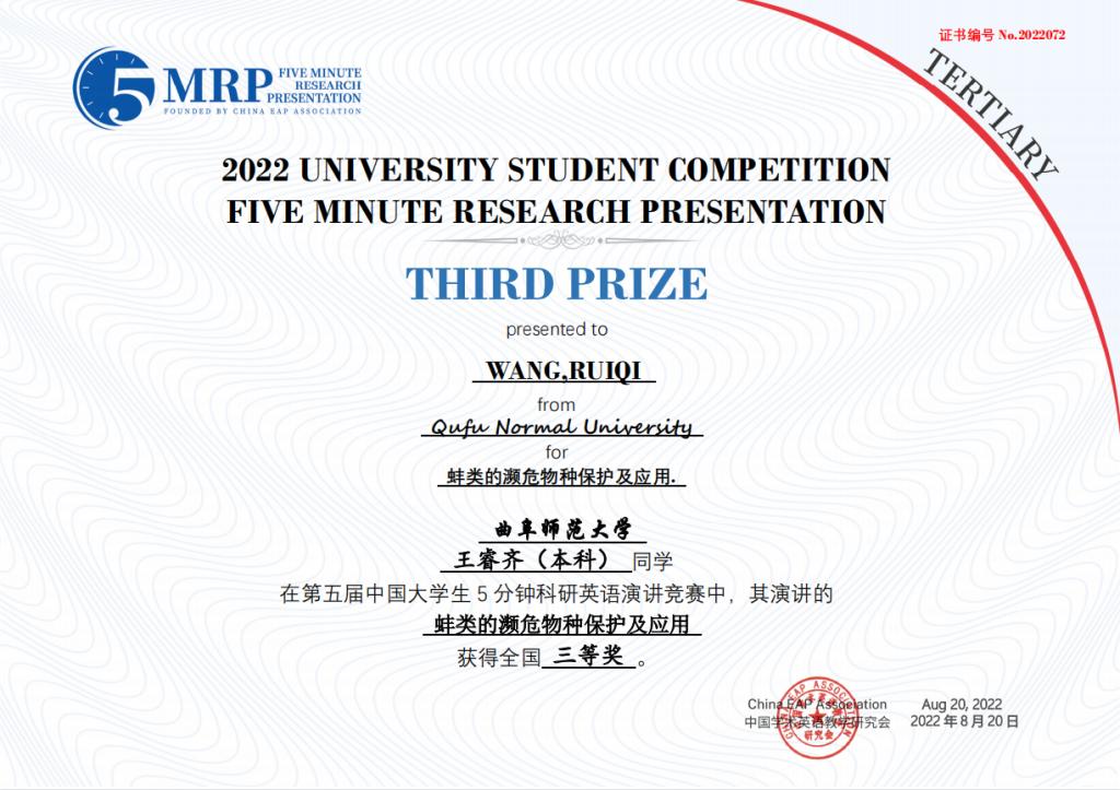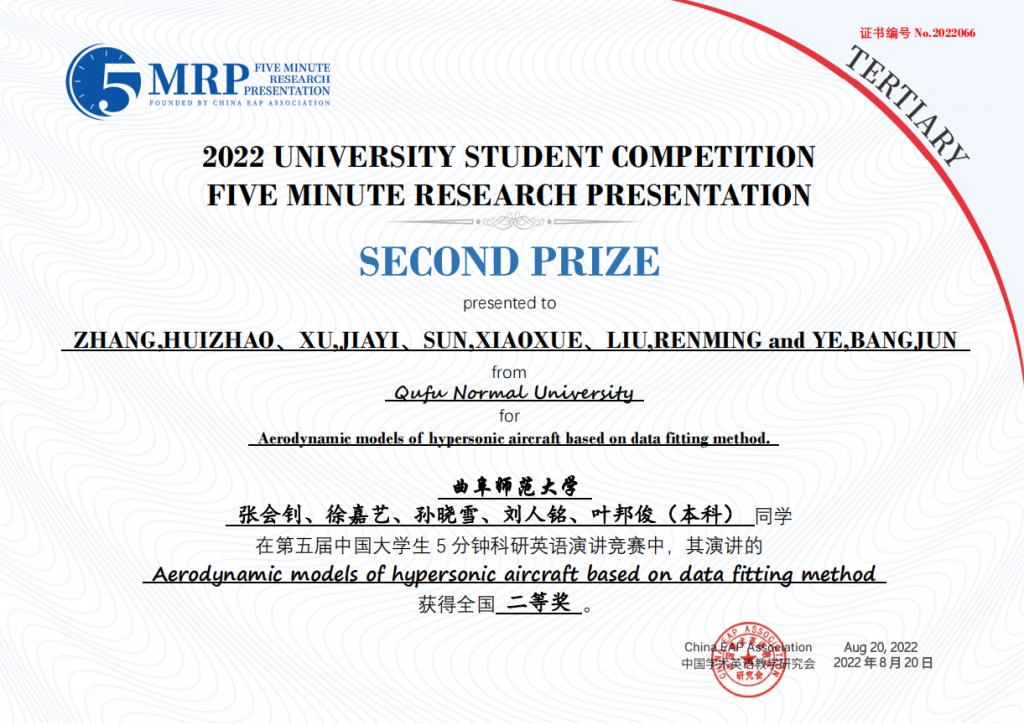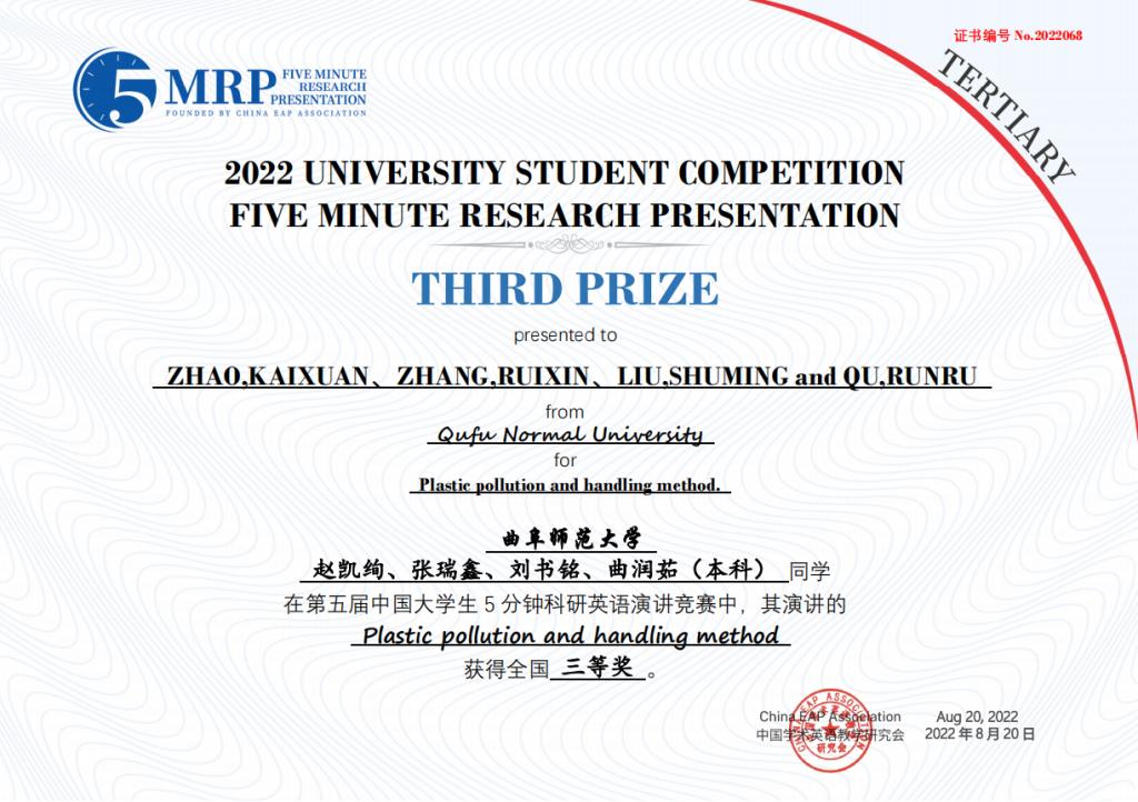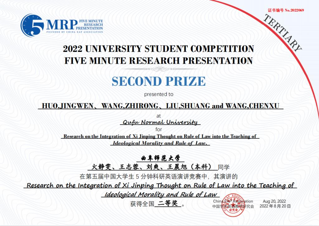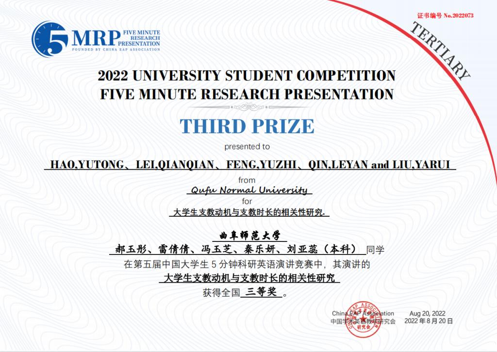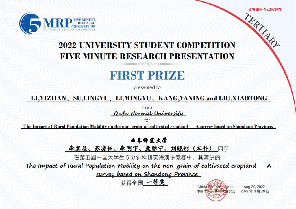 选拔推荐的8个团队取得优异成绩,获得全国一等奖1项、二等奖3项、三等奖4项。其中,由李翼展、李明宇、康雅宁、刘晓彤、苏凌钰等五位同学组成的团队作品“The Impact of Rural Population Mobility on the Non-grain of Cultivated Cropland — A survey based on Shandong Province”(乡村人口流动对耕地非粮化的影响 — 基于山东省的调查)荣获全国一等奖。门超元、孙丕苓等10位教师荣获优秀指导老师奖。