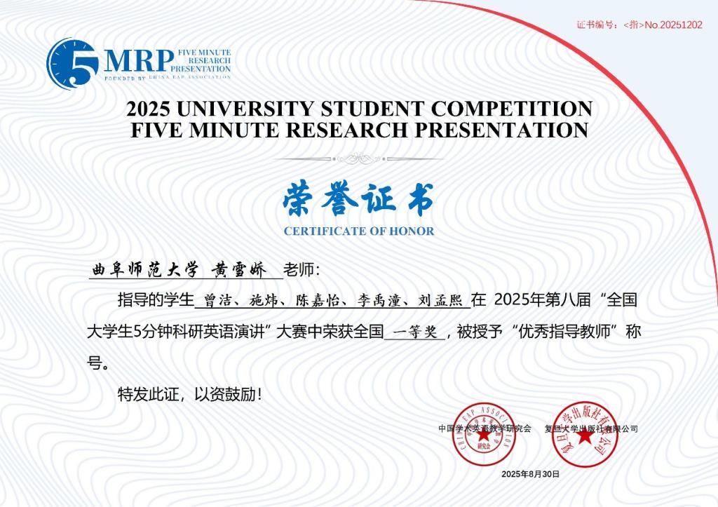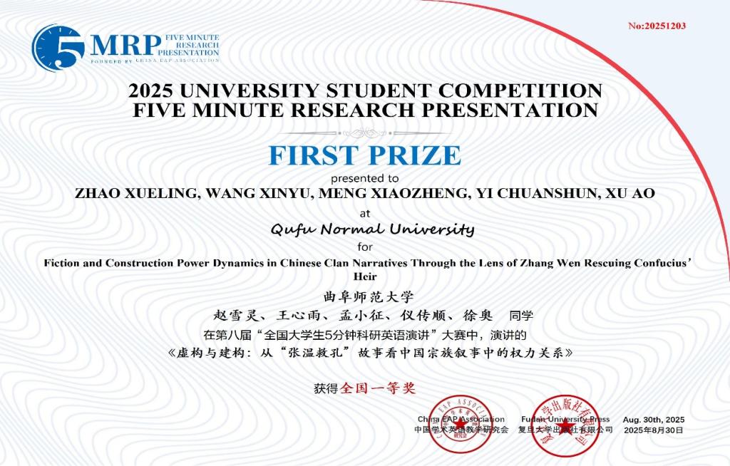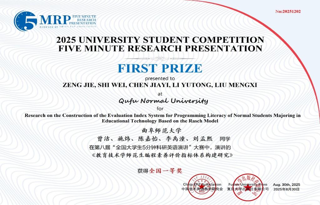 选拔推荐的39支团队取得优异成绩,获得全国一等奖2项、二等奖8项、三等奖12项、优胜奖17项。其中,由曾洁、施炜、陈嘉怡、李禹潼、刘孟熙等同学组成的团队作品“Research on the Construction of the Evaluation Index System for Programming Literacy of Normal Students Majoring in Educational Technology Based on the Rasch Model”和由赵雪灵、王心雨、孟小征、仪传顺、徐奥等同学组成的团队作品“Fiction and Construction Power Dynamics in Chinese Clan Narratives Through the Lens of Zhang Wen Rescuing Confucius’ Heir”荣获全国一等奖;黄雪娇、董伟等老师荣获优秀指导教师奖。