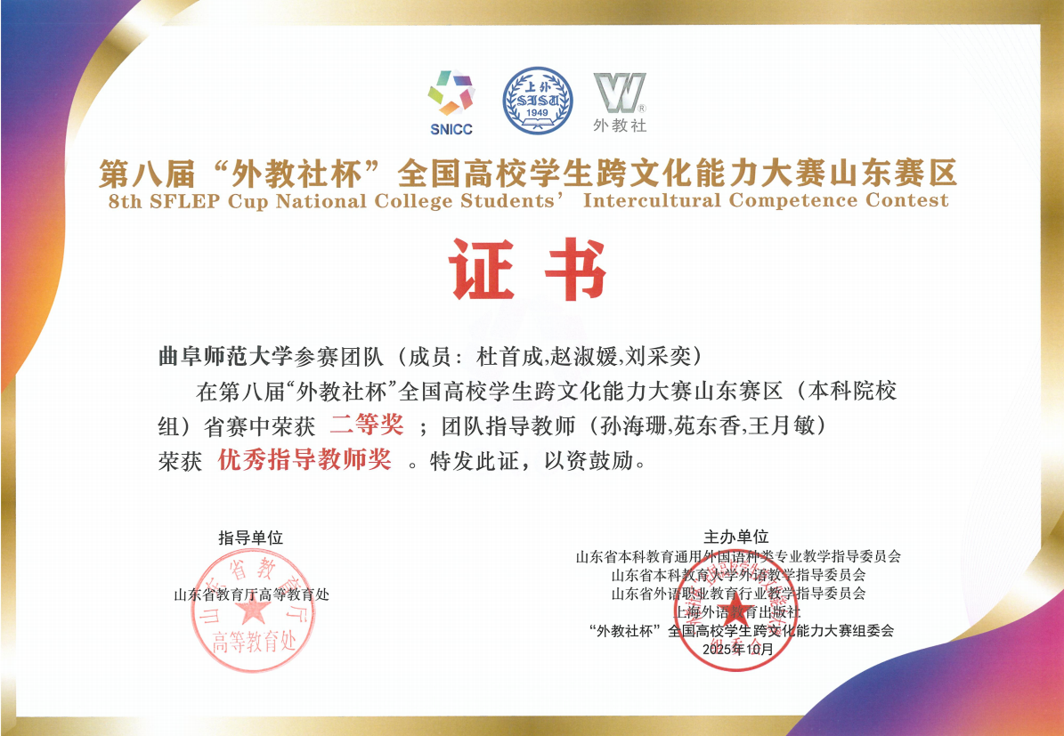 近日,由山东省教育厅高等教育处指导,三大省级教指委与上海外语教育出版社联合主办的第八届“外教社杯”全国高校学生跨文化能力大赛山东赛区本科院校组比赛在山东师范大学圆满落幕。pg娱乐城官网 由杜首成、赵淑媛、刘采奕同学组成的参赛团队,在pg娱乐城官网 孙海珊、苑东香、王月敏三位老师的精心指导下,从全省60所高校的参赛队伍中脱颖而出,荣获省赛二等奖,三位指导教师同步获评“优秀指导教师奖”,充分彰显了曲园学子的跨文化素养与pg娱乐城官网 外语教学的扎实成效。
