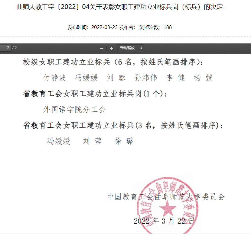 pg娱乐城官网 (日照)分工会荣获pg娱乐城官网 “校级职工建功立业标兵岗”先进集体称号;pg娱乐城官网 (曲阜)分工会主席李健老师荣获pg娱乐城官网 “校级女职工建功立业标兵”个人荣誉称号。