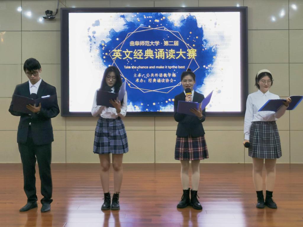 王嫦娟、朱晓蒙、衣进韬、吴涛等老师应邀担任此次大赛评委,她们为选手们的精彩表现给出宝贵的点评与建议。王佳宁、郝文萌、杨丹、吴一凡等同学分获一、二、三等奖。本次比赛的成功举办激发了广大学生重视诵读经典,提高英文表达的积极性和热情。