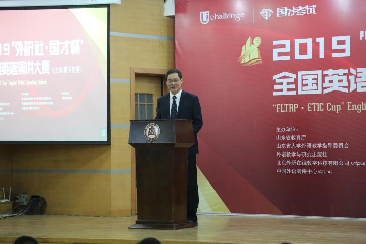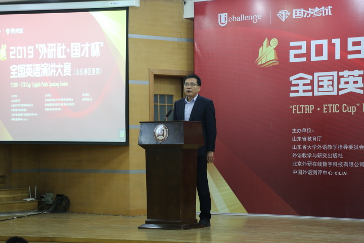 主任王广成教授在致辞中指出:“Uchallenge大学生英语挑战赛”系列,是由山东省教育厅、外语教学与研究出版社等单位联合主办的一项公益赛事,“大赛以高远的立意和创新的理念,顺应时代发展大势,聚焦国家时事热点。大赛既是当代大学生展现风采、实现自我的舞台,也是外语教育领域凝聚创新、融通中外的交流媒介。”是唯一纳入“中国高校创新人才培养暨学科竞赛评估项目”的英语竞赛。希望参赛同学在比赛中能够收获赛场经历,学习优秀选手身上的亮点;领悟语言表达魅力,目睹思想碰撞火花;在高手云集的舞台上展现自我、提高自我。作为此次比赛的具体承办者,一定本着公平、公正、公开的原则组织赛事,认认真真、尽心尽力地为大家做好服务。