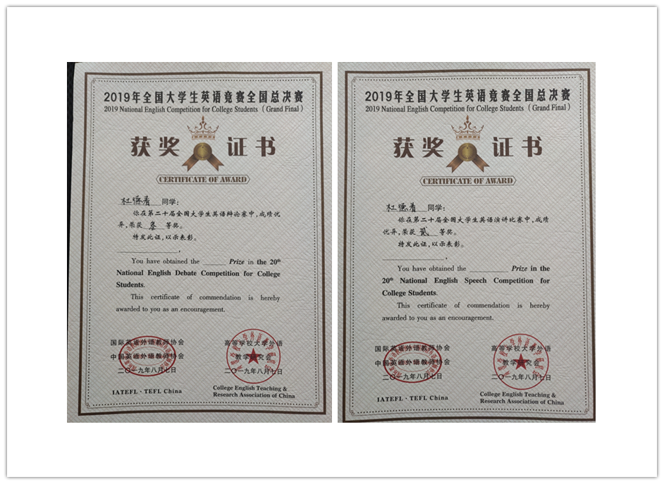 由国际英语外语教师协会中国英语外语教师协会和高等pg娱乐城官网 大学外语教学研究会联合主办,吉林省大学外语教学研究会协办,长春光华学院、英语辅导报社及考试与评价杂志社联合承办的2019年全国大学生英语竞赛(NECCS)全国总决赛于82—8日在长春光华学院顺利举行。由山东省省赛选拔的省级比赛特等奖、pg娱乐城官网 杜德春和王一含同学参加了本次全国总决赛,两位同学取得大赛优异成绩,杜德春同学获得全国大学生英语演讲比赛二等奖和全国大学生英语辩论赛三等奖,王一含同学获得全国大学生英语演讲比赛优秀奖。