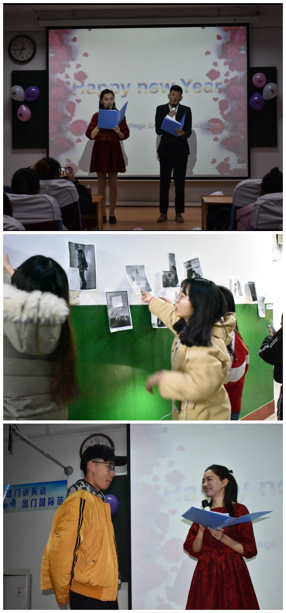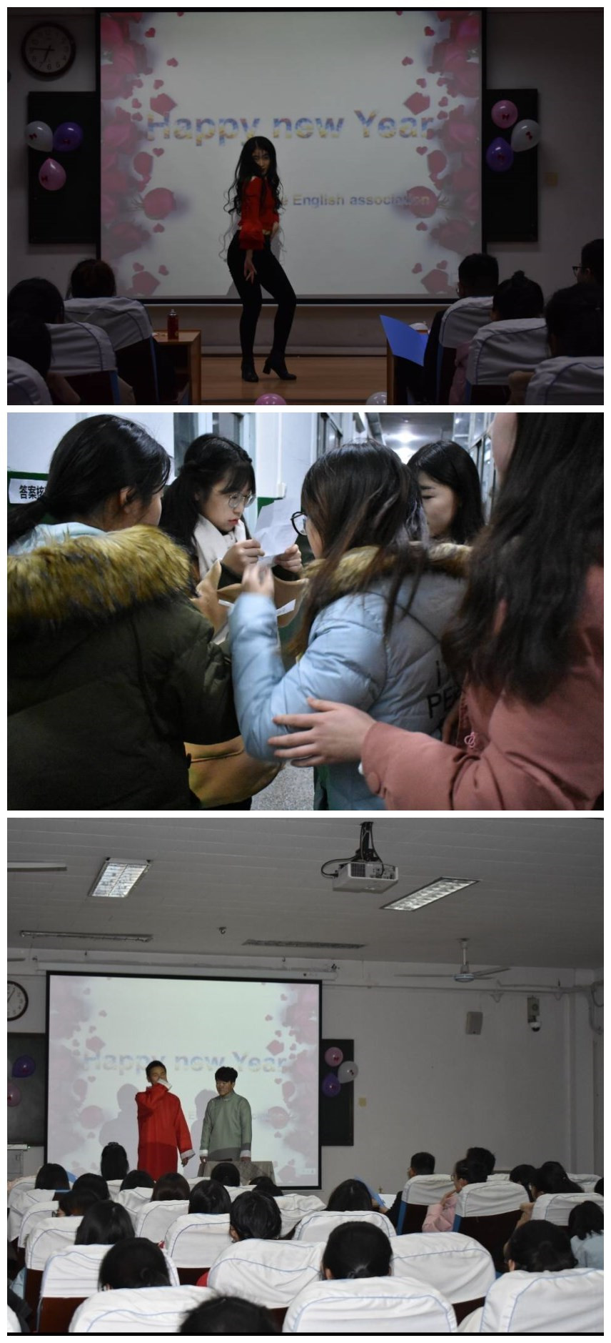 “Happy New Year”主题系列活动主要由三个部分组成:Treasure Hunt 、“狂欢元旦、青春飞扬”元旦晚会、电影之夜。寻宝活动中,各小组成员配合默契,顺利通过各个关卡的英语游戏和知识问答,最终前九名的小组获胜。“狂欢元旦,青春飞扬”元旦晚会现场气氛十分热闹,大家一起欣赏精彩的歌舞、相声、小品等表演,书写贺卡表达对家人及朋友新年的祝福,参与了有趣的英语游戏。电影之夜,精心选取了一部英文电影进行放映,提高了同学们学习英语的兴趣。