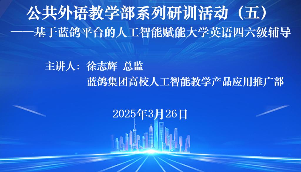 举办2024-2025学年春季学期第五场全员研训活动,本次研训以“基于蓝鸽平台的人工智能赋能大学英语四、六级辅导” 为主题,邀请蓝鸽集团有限公司高校人工智能教学产品应用推广部总监徐志辉作专题讲座,进行技术应用辅导,pg娱乐城官网